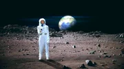 Mona steht in einem Raumanzug in einer Mondlandschaft. Im Hintergrund ist die Erde zu sehen.Bild: © WDR/tvision