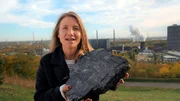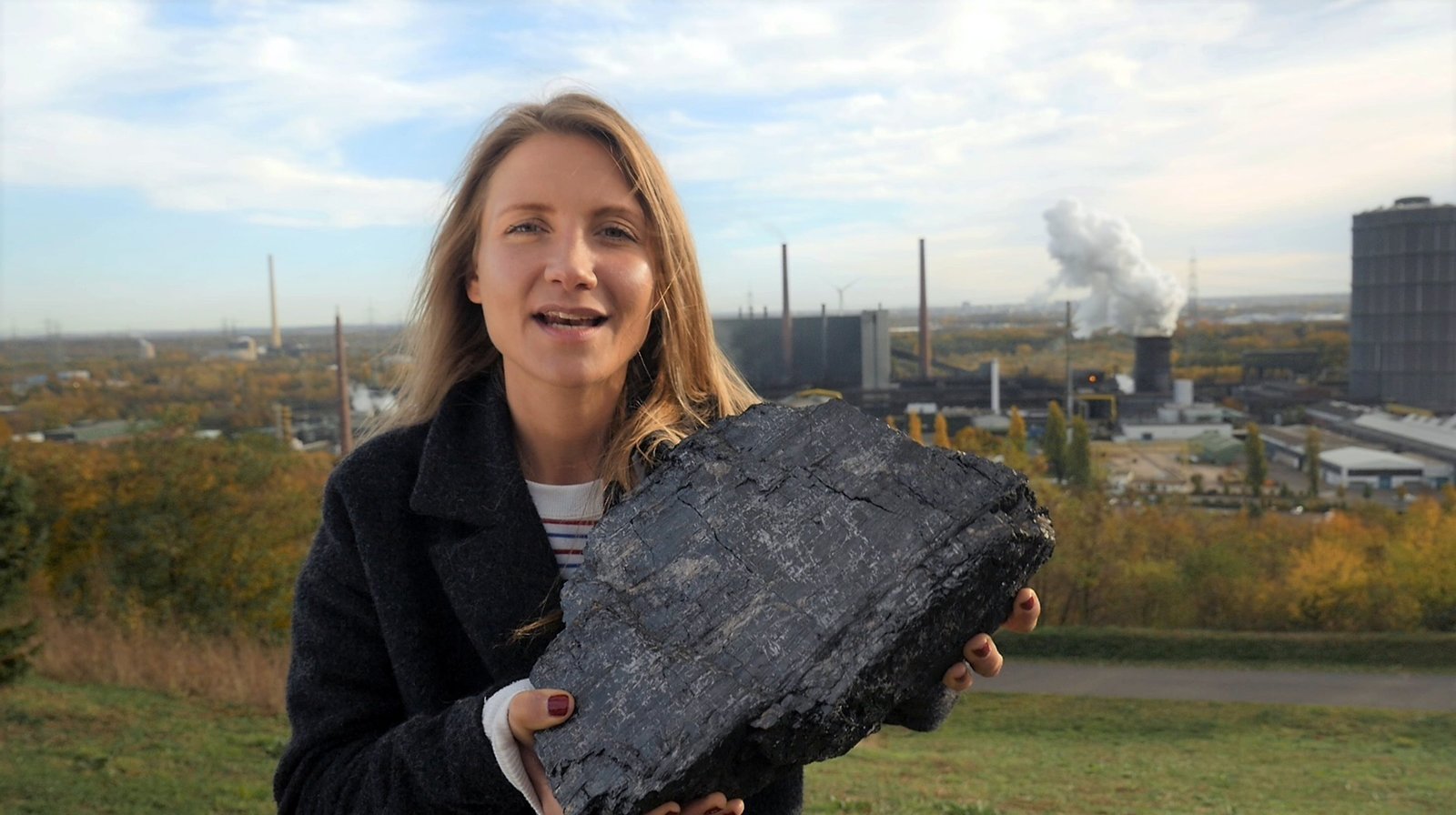 SENDER: ARD - SENDETITEL: neuneinhalb - UNTERTITEL: Das Ende der Steinkohle - Wie geht es weiter im Ruhrgebiet? - CAPTION: ARD/WDR NEUNEINHALB, "Das Ende der Steinkohle - Wie geht es weiter im Ruhrgebiet?", am Samstag (15.12.18) um 08:15 Uhr im ERSTEN..Jana steht auf einem Hügel vor der Kokerei Prosper im Ruhrgebiet. Sie hält ein großes Stück Steinkohle in der Hand..© WDR/tvision, honorarfrei - Verwendung gemäß der AGB im engen inhaltlichen, redaktionellen Zusammenhang mit genannter WDR-Sendung bei Nennung "Bild: WDR/tvision" (S2+). WDR Presse und Information/Redaktion Bild, Köln, Tel: 0221/220 -7132 oder -7133, Fax: -777132, bildredaktion@wdr.deBild: © WDR/tvision