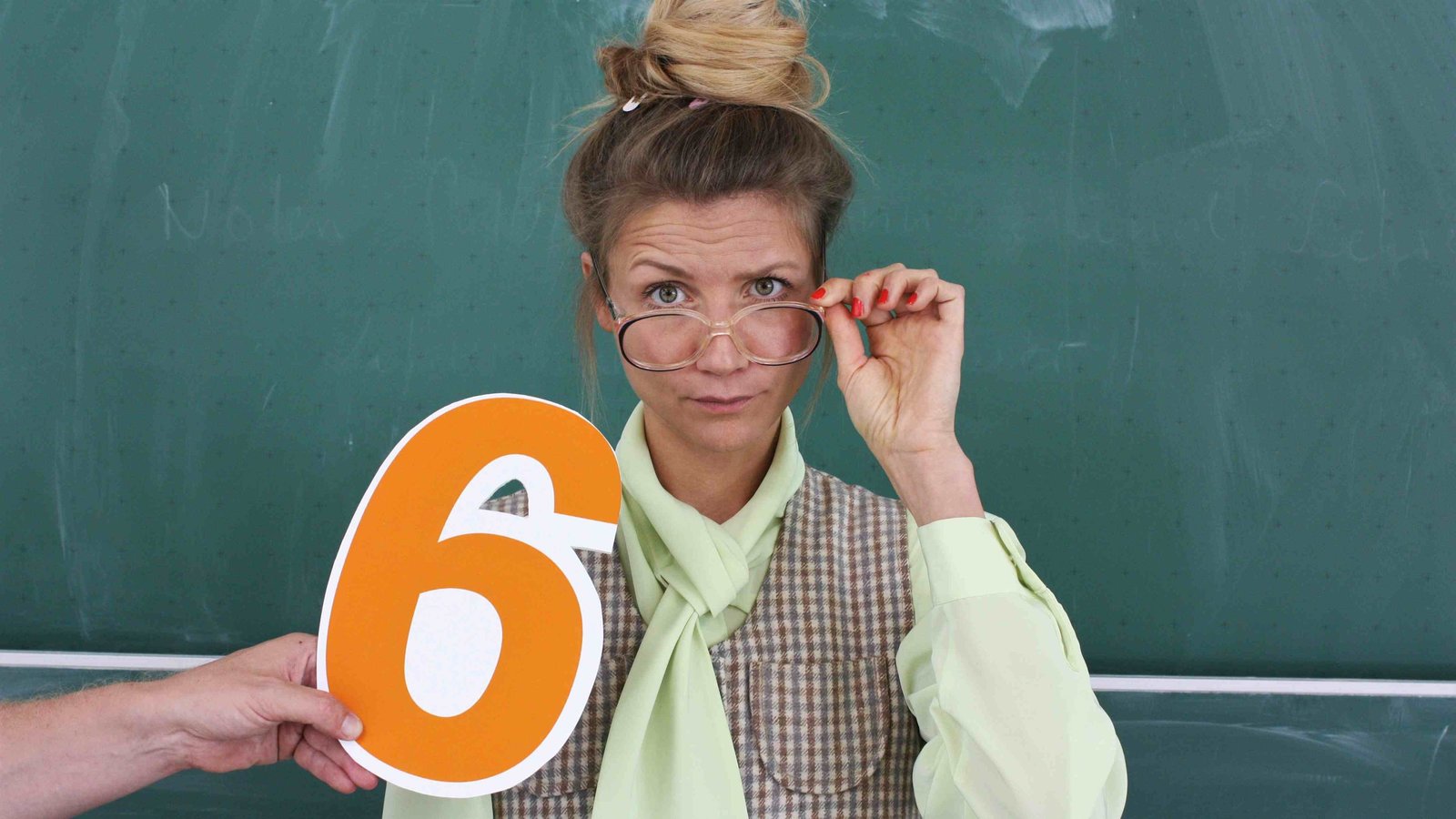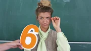 Jana steht als Lehrerin verkleidet vor einer Schultafel und blickt streng über ihre Brille hinweg. Sie möchte wissen, wie guter Unterricht geht und besucht dazu die Robert-Bosch-Gesamtschule in Hildesheim.Bild: © WDR/tvision