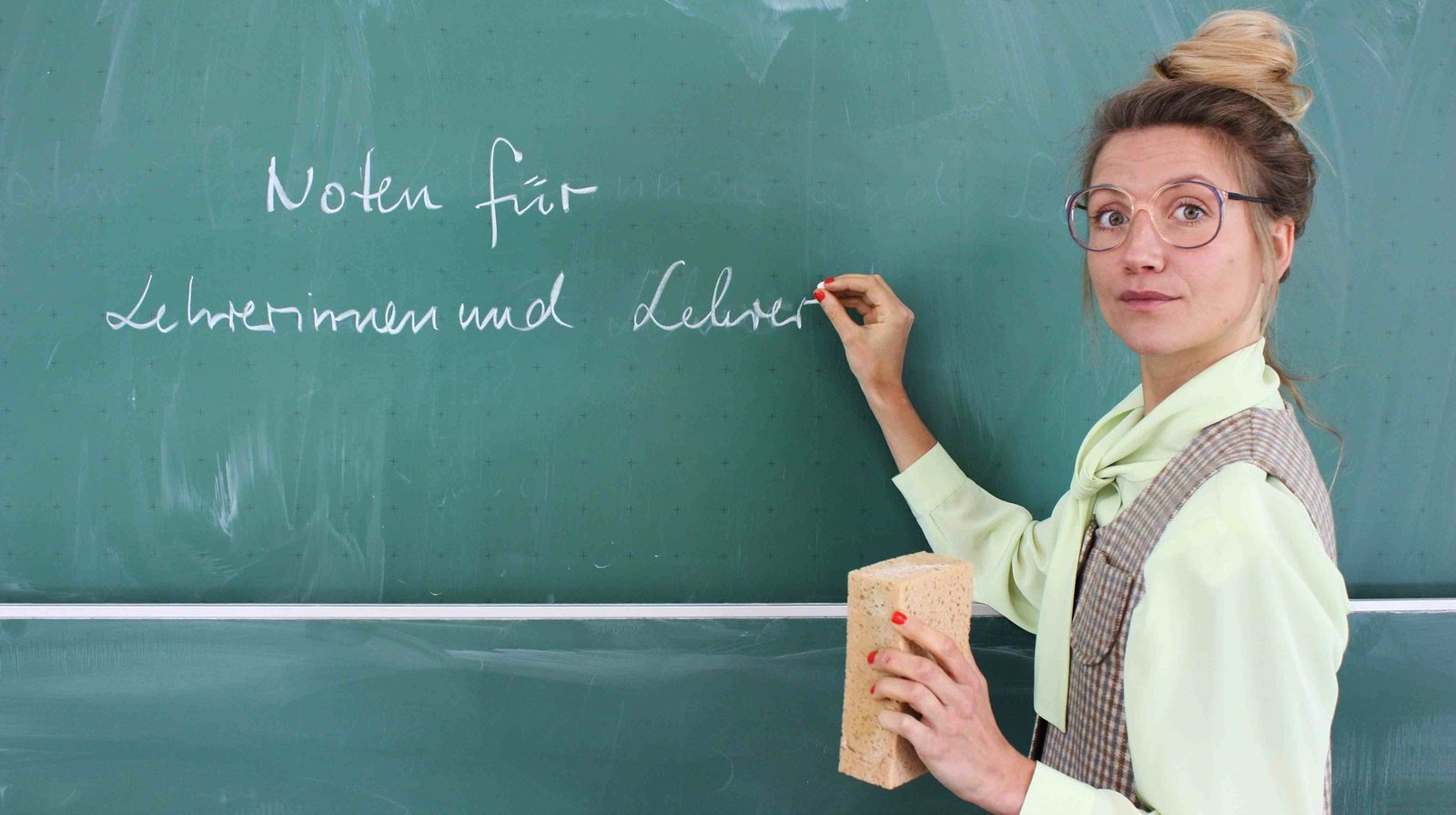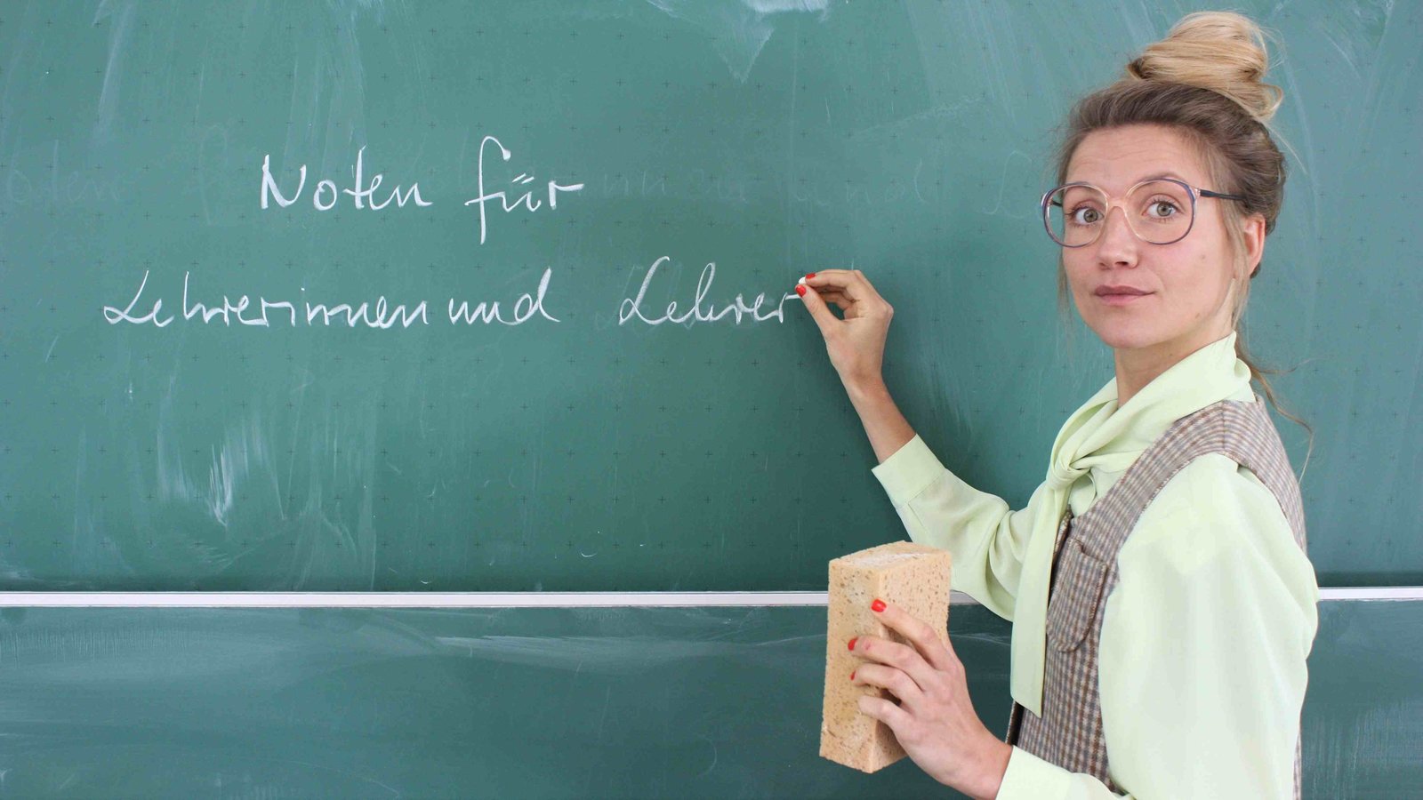 Jana steht als strenge Lehrerin verkleidet mit Schwamm und Kreide an der Tafel. Sie besucht die Robert-Bosch-Gesamtschule in Hildesheim und will wissen, wie guter Unterricht geht.Bild: © WDR/tvision
