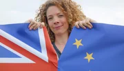 Gesa beschäftigt sich heute mit dem Thema "Goodbye EU - Die Briten stimmen für den Brexit" und trennt eine Fahne in der Mitte – links ist die Flagge Großbritanniens zu sehen, rechts die der EU.Bild: © WDR/tvision