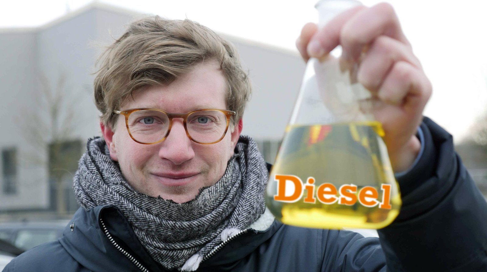 Robert hält einen Erlenmeyerkolben in der Hand. Darin ist eine gelbe Flüssigkeit. Auf dem Kolben steht der graphische Schriftzug „Diesel“.Bild: © WDR/tvision