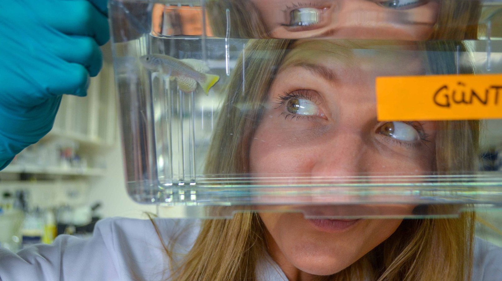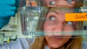 Jana beschäftigt sich heute mit dem Thema "Langes Leben - Wie alt können wir werden?" Sie blickt durch ein kleines Aquarium, in dem Kili-Fisch Günther schwimmt.Bild: © WDR/tvision