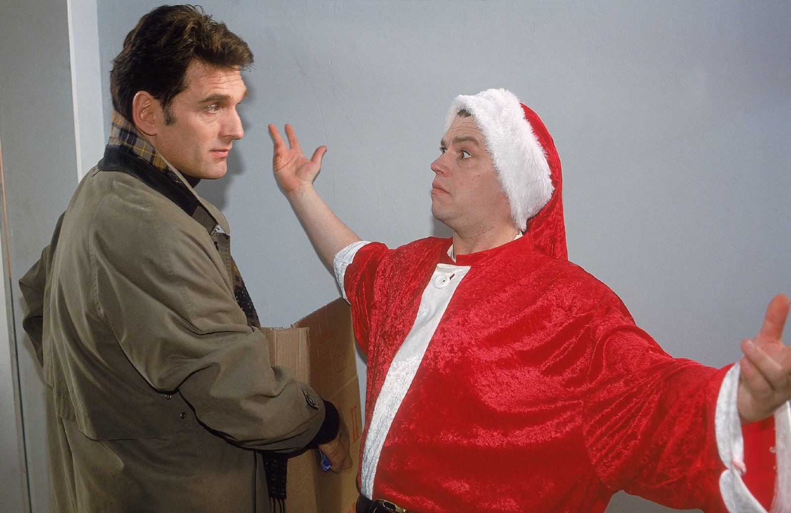 Nikolas NikolausSchmidt (Walter Sittler, li.) ist völlig genervt von dem ganzen Weihnachtsrummel. Erst recht, weil er zuschauen muss, wie Tim (Oliver Reinhard) sich in Weihnachtskostüme zwängt...Bild: © RTLplus