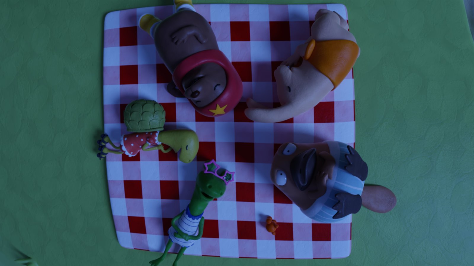 Ich kann nicht einschlafen!Marilu, Tüftel, Bio, Nö-Nö, Karli Krebs und Undine liegen auf der Picknickdecke (v.l.n.r.).Bild: © hr/Miam/Autour de minuit