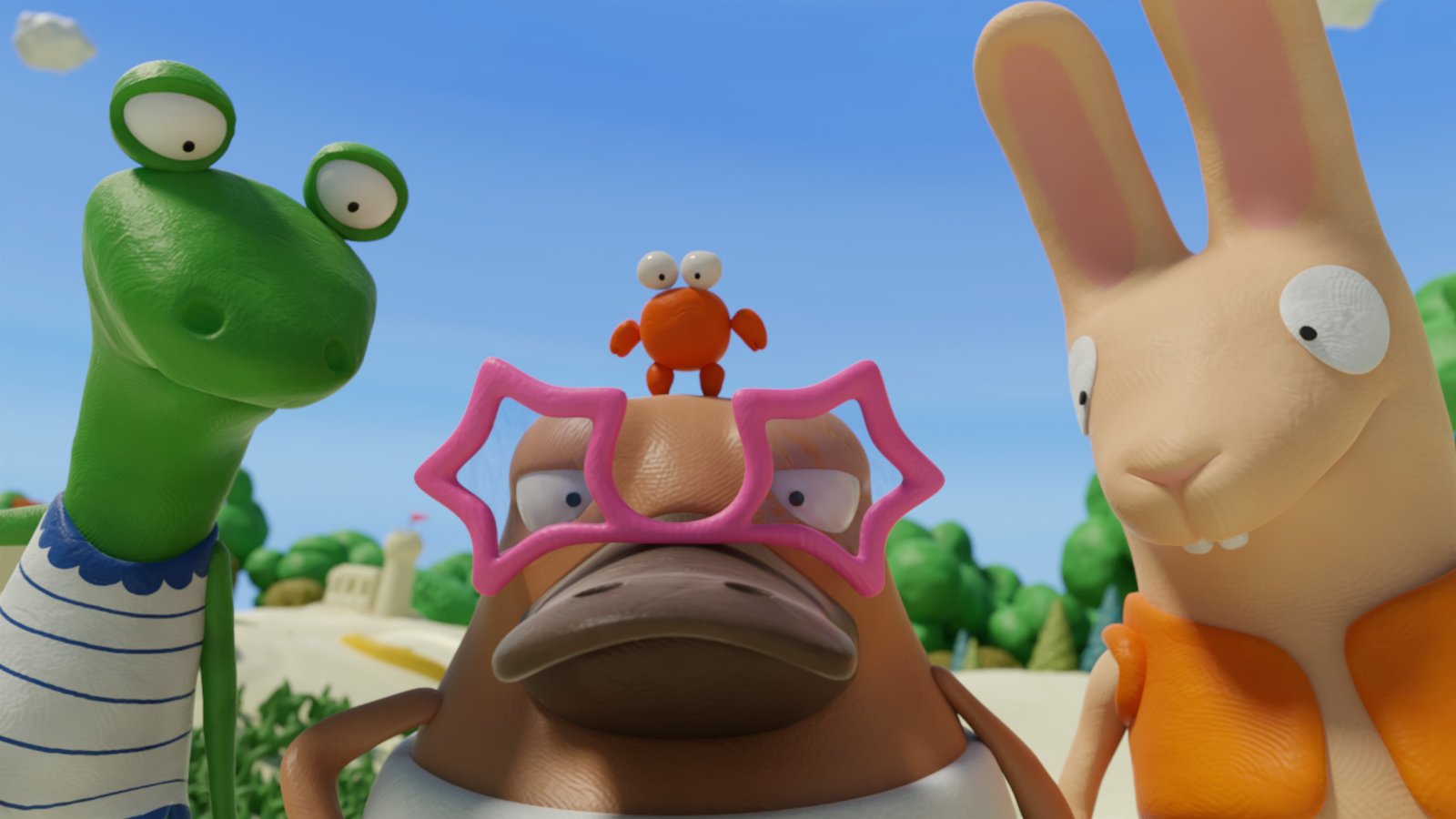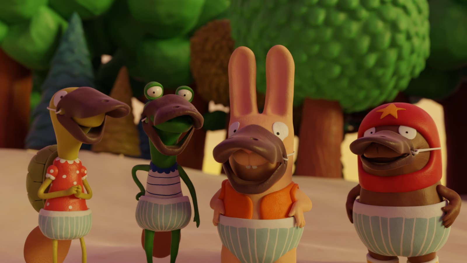 Ich finde kein passendes Kostüm!Verkleiden sich als Schnabeltier: (v.l.) Marilu, Undine, Bio und Tüftel.Bild: © hr/Miam/Autour de minuit