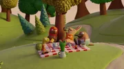 Ich kann nicht einschlafen!Beim Picknick: (v.l.n.r.) Marilu, Tüftel, Undine, Bio, Karli und Nö-Nö.Bild: © hr/Miam/Autour de minuit
