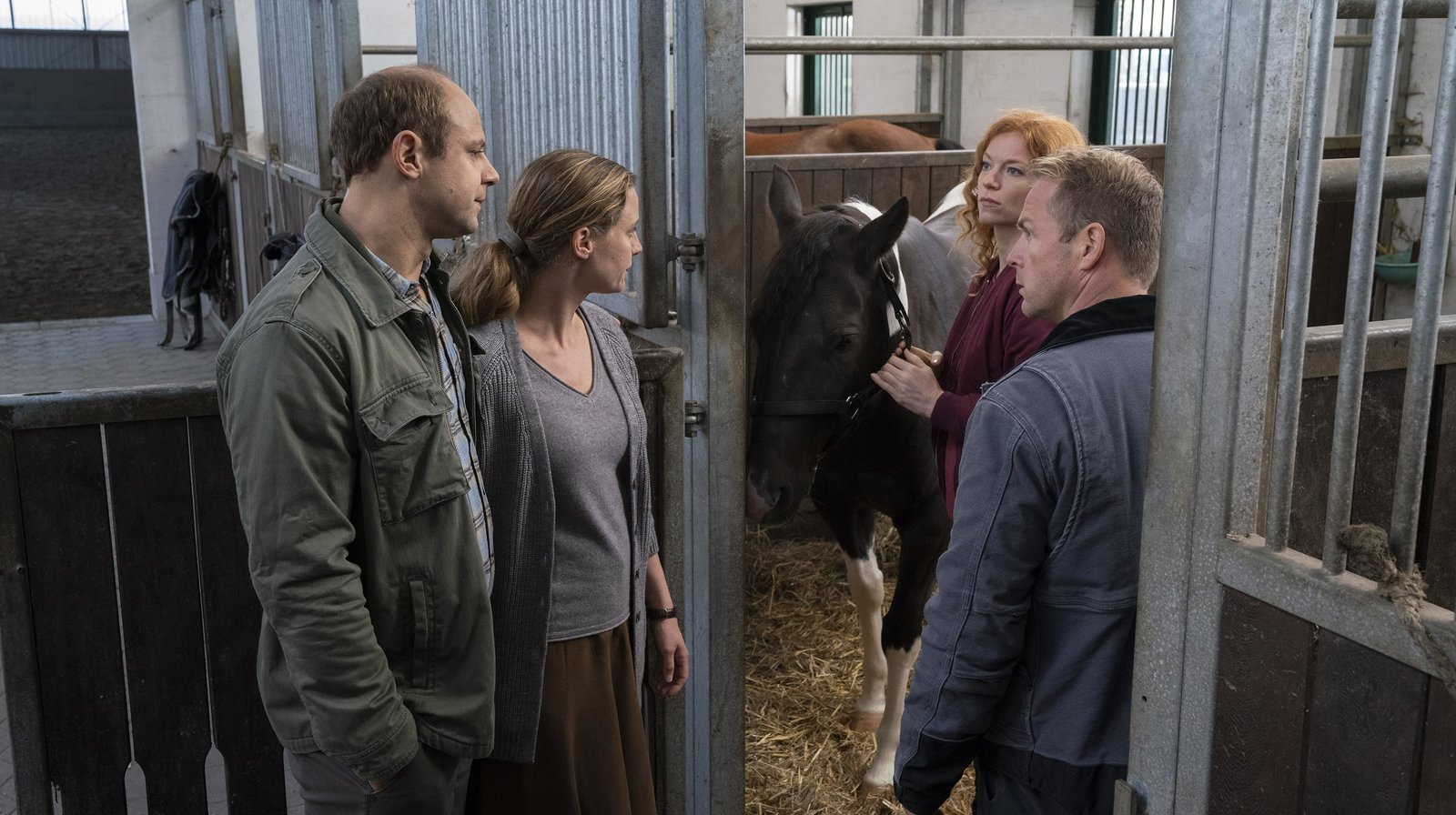 Dinge des LebensVisite beim kranken Pferd, v.l.n.r. Ehepaar Müller (Moritz Führmann, Picco von Groote), Jule Christiansen (Marleen Lohse), Hauke Jacobs (Hinnerk Schönemann)Bild: © NDR/Georges Pauly