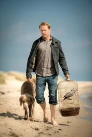 Käpt'n HookARD/NDR NORD BEI NORDWEST - KÄPT'N HOOK, am Donnerstag (06.11.14) um 20:15 Uhr im ERSTEN. Hauke Jacobs (Hinnerk Schönemann) mit Hund Holly und Papagei Hook am Strand von Schwanitz.Bild: © NDR/Gordon Timpen