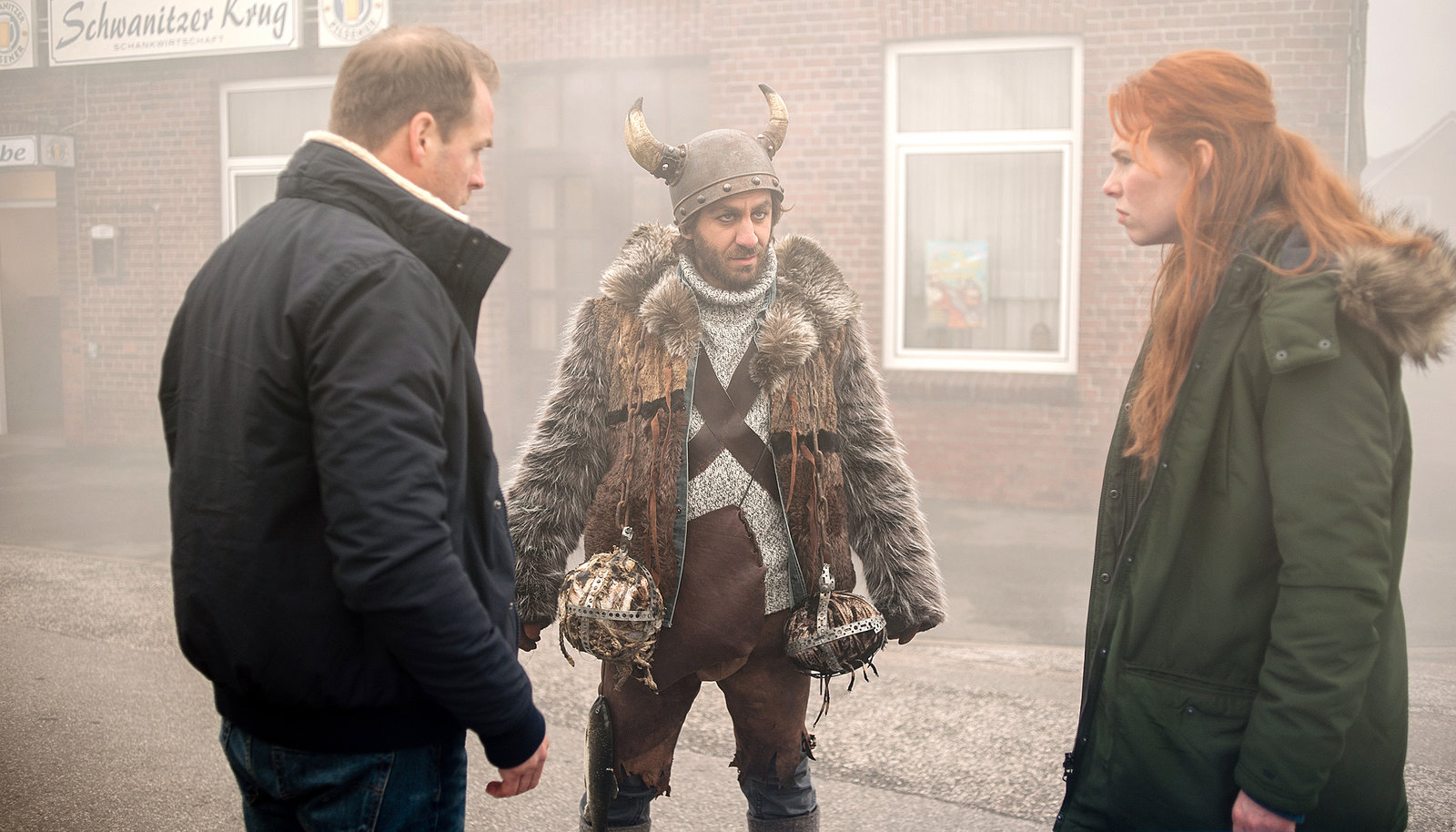 Der wilde SvenMehmet Ösker (Cem-Ali Gültekin) wird von Hauke Jacobs (Hinnerk Schönemann, l.) und Lona (Henny Reents, r.) zum wilden Sven befragt.Bild: © NDR/Gordon Timpen