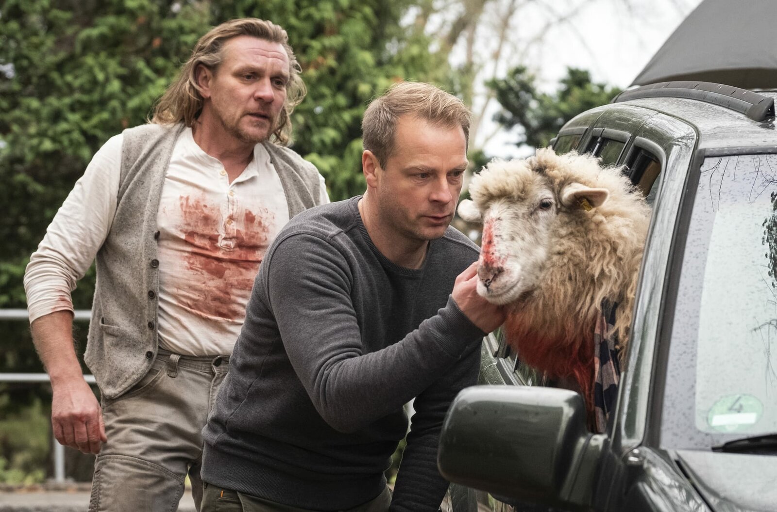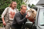 Ein Killer und ein halberSchäfer (Thomas Ziesch, li.) lässt sein Schaf von Tierarzt Hauke Jacobs (Hinnerk Schönemann) behandeln.Bild: © NDR/ARD Degeto/Christine Schroeder