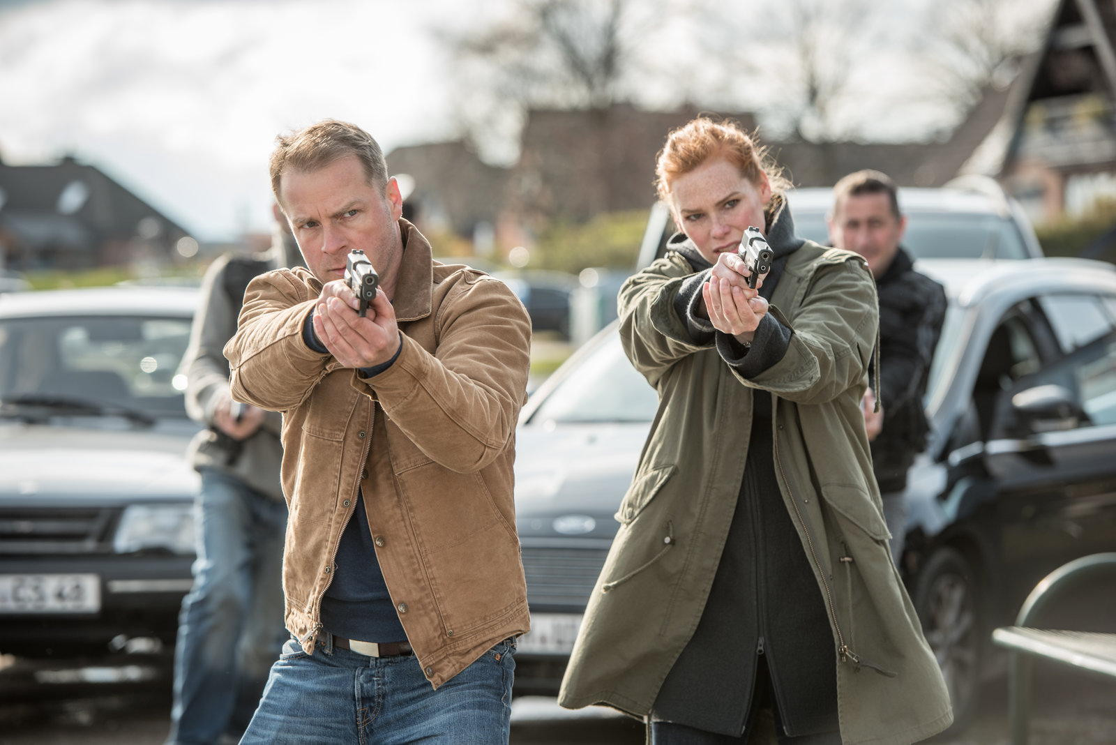 Estonia"Nord bei Nordwest - Estonia", Ein Schusswechsel in einer Seniorenresidenz jagt Dorfpolizistin Lona Vogt kalte Schauer über den Rücken. Dort lebt ihr verwitweter Vater Reimar. Tatsächlich verdichten sich alsbald die Hinweise, der ehemalige Handlungsreisende könnte von seiner dunklen Vergangenheit eingeholt worden sein. Ungewollt in den Fall verstrickt sich unterdessen Tierarzt Hauke Jacobs, als er - alarmiert von den Schüssen - dem verletzten Angreifer zu Hilfe eilen will. Mit letzter Kraft steckt ihm der Sterbende ein Stück Metall entgegen, dass ungeahnt viel Sprengkraft besitzt.Im Bild (v.li.): Henny Reents (Lona Vogt), Hinnerk Schönemann (Hauke Jacobs), Marleen Lohse (Jule Christiansen).Bild: © SWR/NDR/Degeto/GORDON Photography