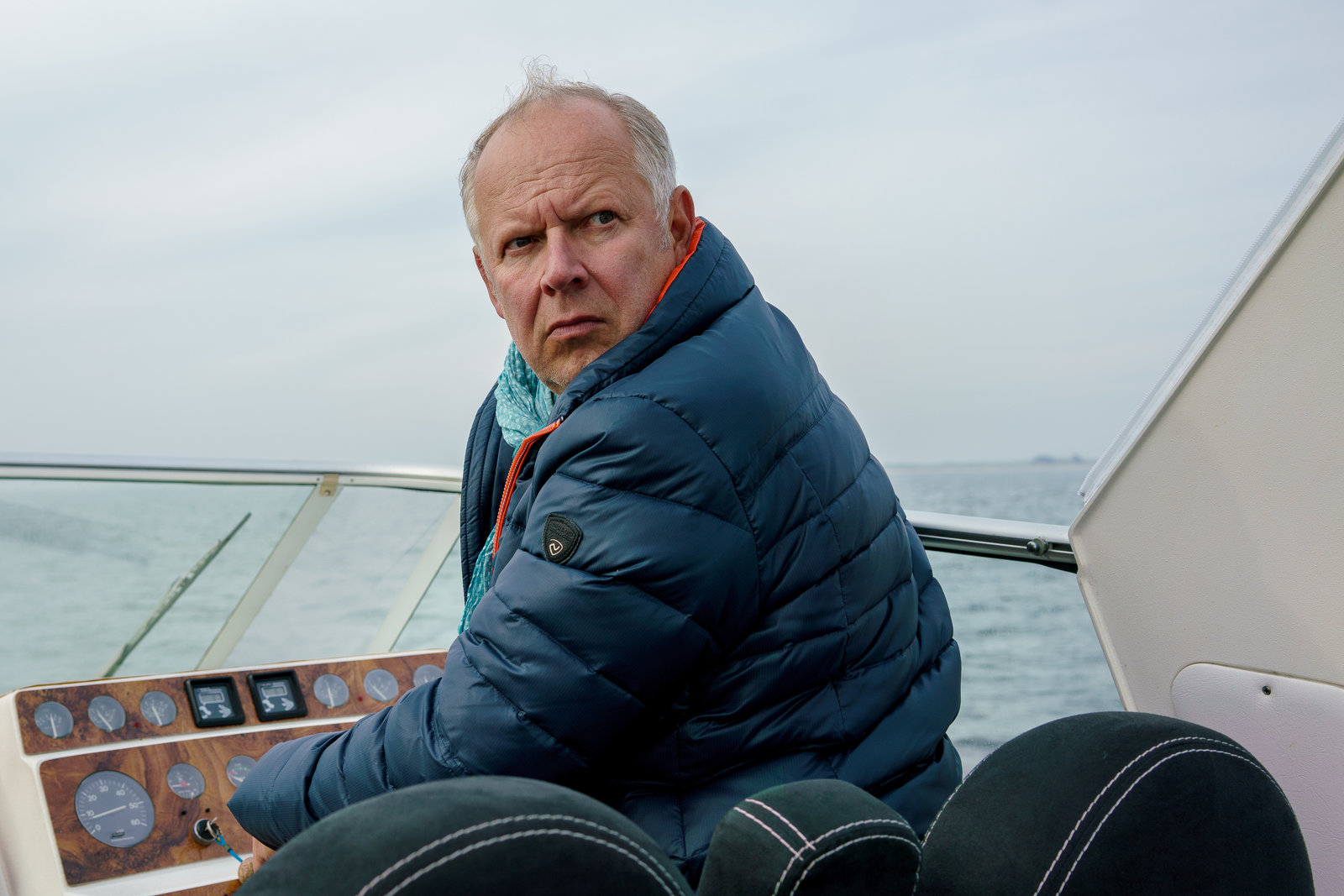 Clüver und die tödliche AffäreEs bestehen Zweifel, dass Robert Kipling bei einem Segelunfall gestorben ist. Dadurch gerät Bernadette Kipling (Annette Frier) unter Verdacht. Trotzdem kann Theo Clüver (Robert Atzorn) seine Gefühle für sie nicht verbergen.Bild: © ZDF und Simon Vogler.