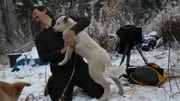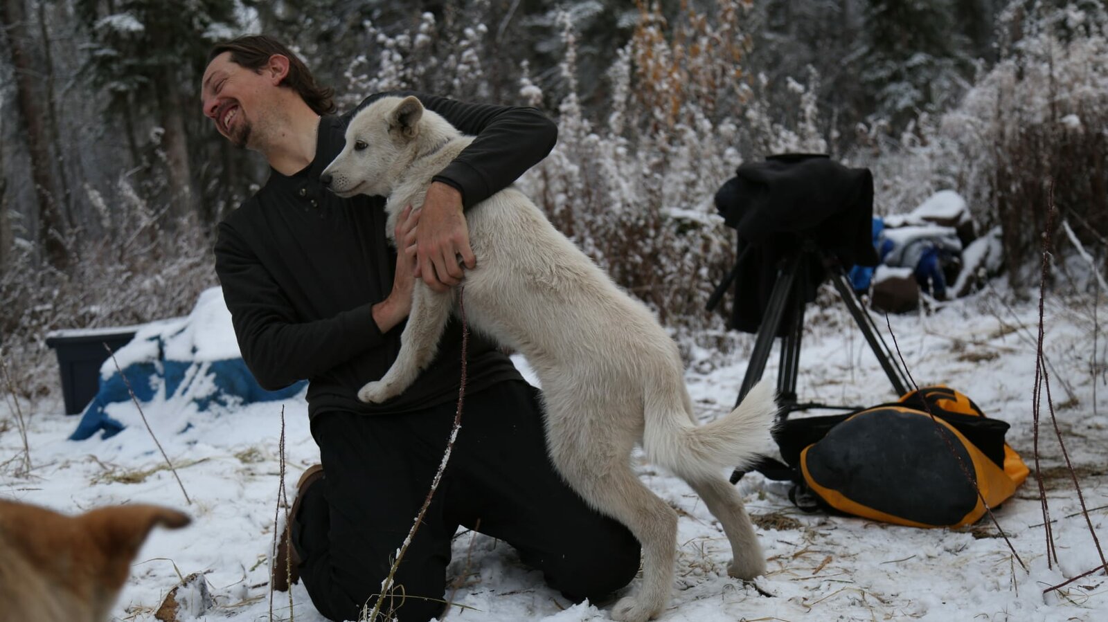 Vorbereitung auf den WinterBehind the scenes of a crew member being loved on by a white dog in the snow.Bild: © Discovery Communications