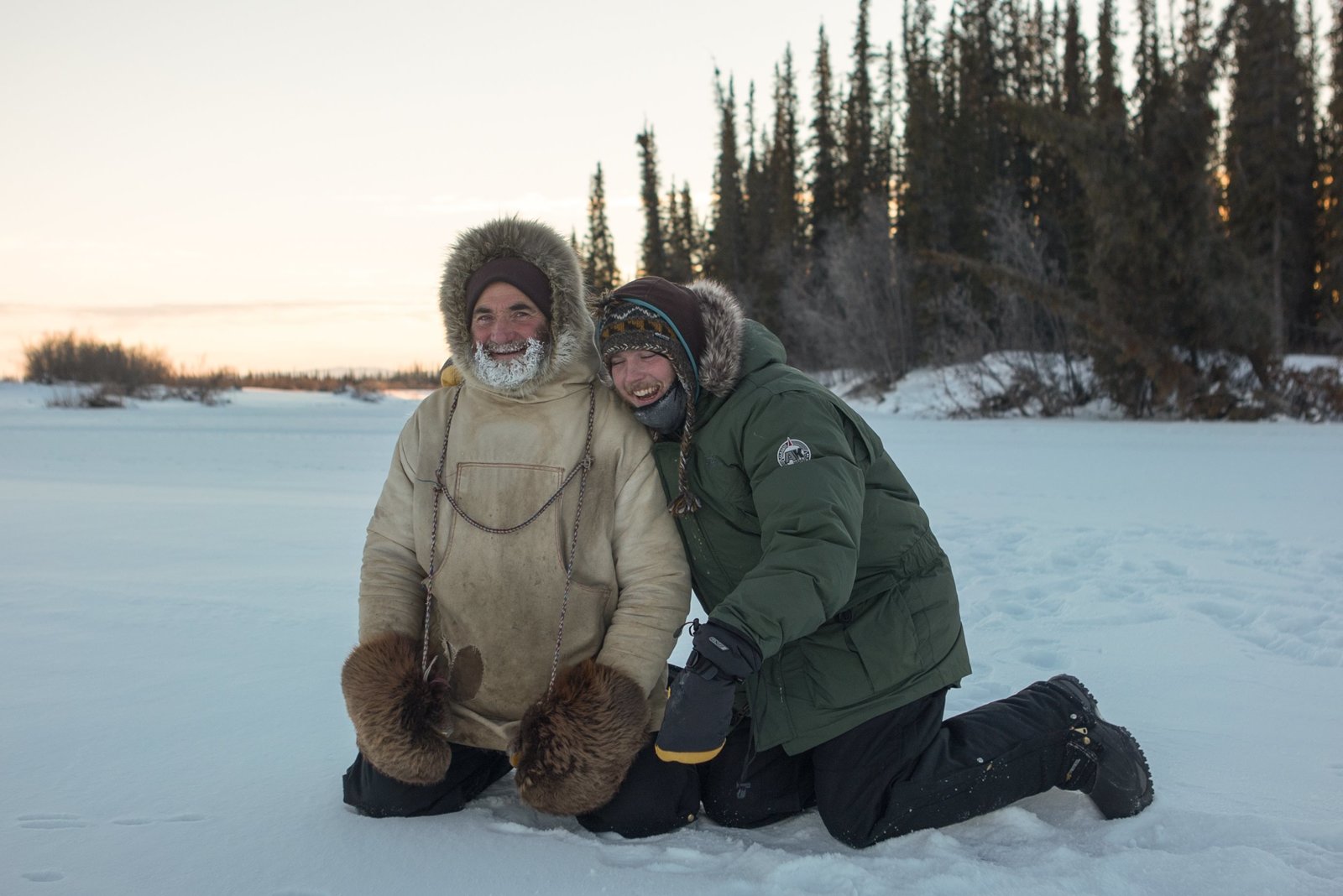 Der letzte SonnenuntergangHeimo and a crew member kneeling in the snow.Bild: © Animal Planet / Discovery Communications