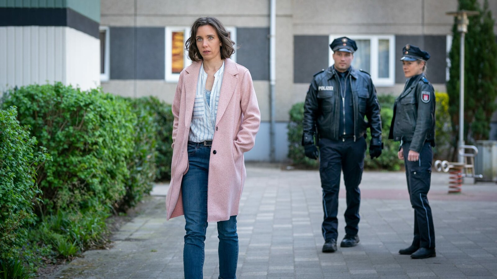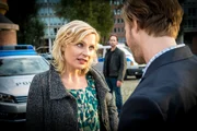 Heißer AbrissKai (Markus Knüfken, l.) und Melanie (Sanna Englund, 2.v.l.) befragen Olaf Rennerts Frau (Anna von Berg, 2.v.r.): Hat sie entscheidende Hinweise, die die Ermittlung weiterbringen?Bild: © ZDF und Boris Laewen