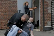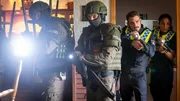 Finja (5), entführtKris (Marc Barthel, 2.v.r.) und Pinar (Aybi Era, r.) stürmen mit dem SEK (Komparsen), das Haus des vermeintlichen Entführers von Finja Wöhrmann.Bild: © ZDF und Boris Laewen./Boris Laewen