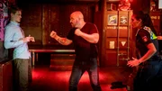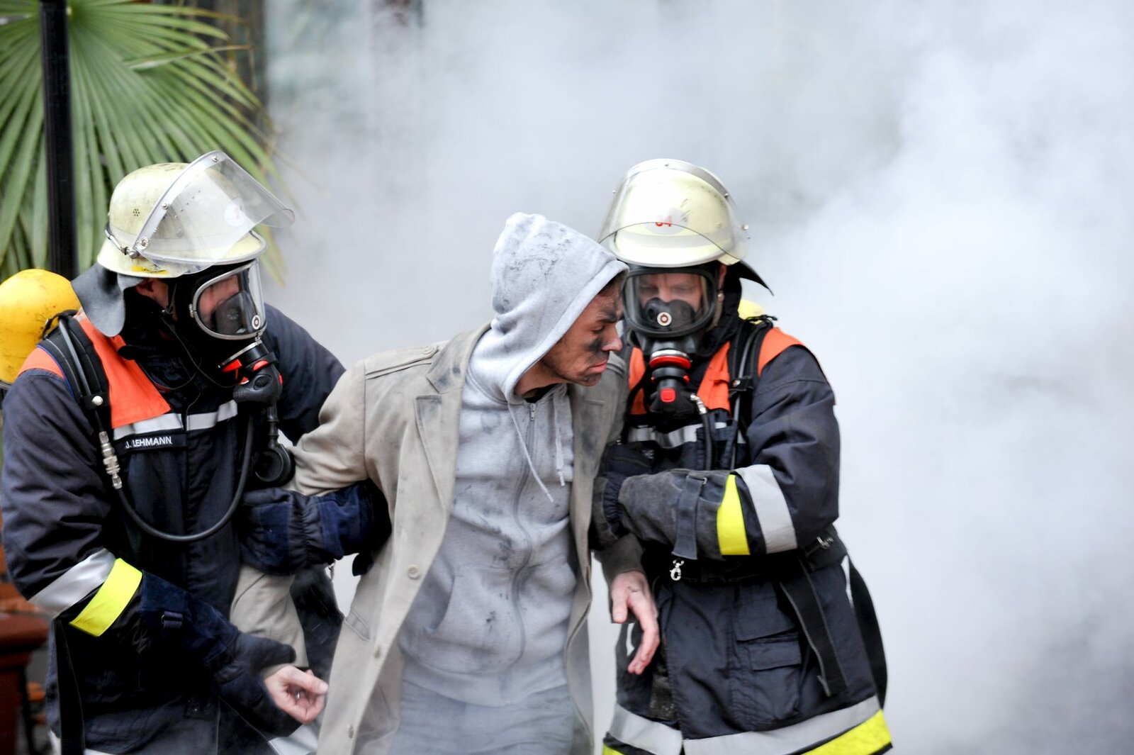 Heißer AbrissZwei Feuerwehrmänner (Komparsen) retten Rüdiger Müller (Anian Zollner, M.) aus dessen brennendem Restaurant.Bild: © ZDF und Boris Laewen./Boris Laewen