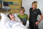 Gefährliche FotosMelanie (Sanna Englund, r.) bringt Max (Maxi Alber, M.) zu seinem verletzten Vater (Henning Vogt, l.) ins EKH.Bild: © ZDF und Boris Laewen./Boris Laewen