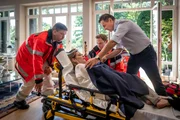 Der verlorene SohnLiese Goll (Brigitte Antonius, liegend) ist in der Praxis von Dr. Metzinger zusammengebrochen und wird von der zufällig anwesenden Anna (Marie-Lou Sellem, l.) direkt behandelt.Bild: © ZDF und Boris Laewen