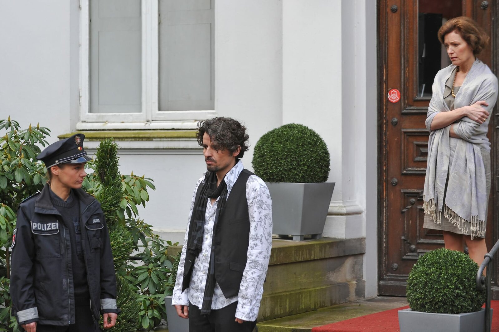 FamiliensacheAlexander Schmölzer (Peter Davor, r.) hat seine Frau Laura (Stephanie Japp) in ihrem Haus gefesselt vorgefunden. Dr. Haase (Fabian Harloff, 2.v.r.) kümmert sich um die unter Schock stehende Frau.Bild: © ZDF und Boris Lasewen.