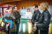 Der große BluffWährend sich Dr. Haase (Fabian Harloff, r.) um den angeschossenen Wachmann Eike Seibert (Mike Hoffmann, 2.v.r.) kümmert, befragen Claudia (Janette Rauch, l.) und Tarik (Serhat Cokgezen, 2.v.l.) dessen Freundin Nicole Bettermann (Stephanie Stumph, M.).Bild: © ZDF und Boris Laewen