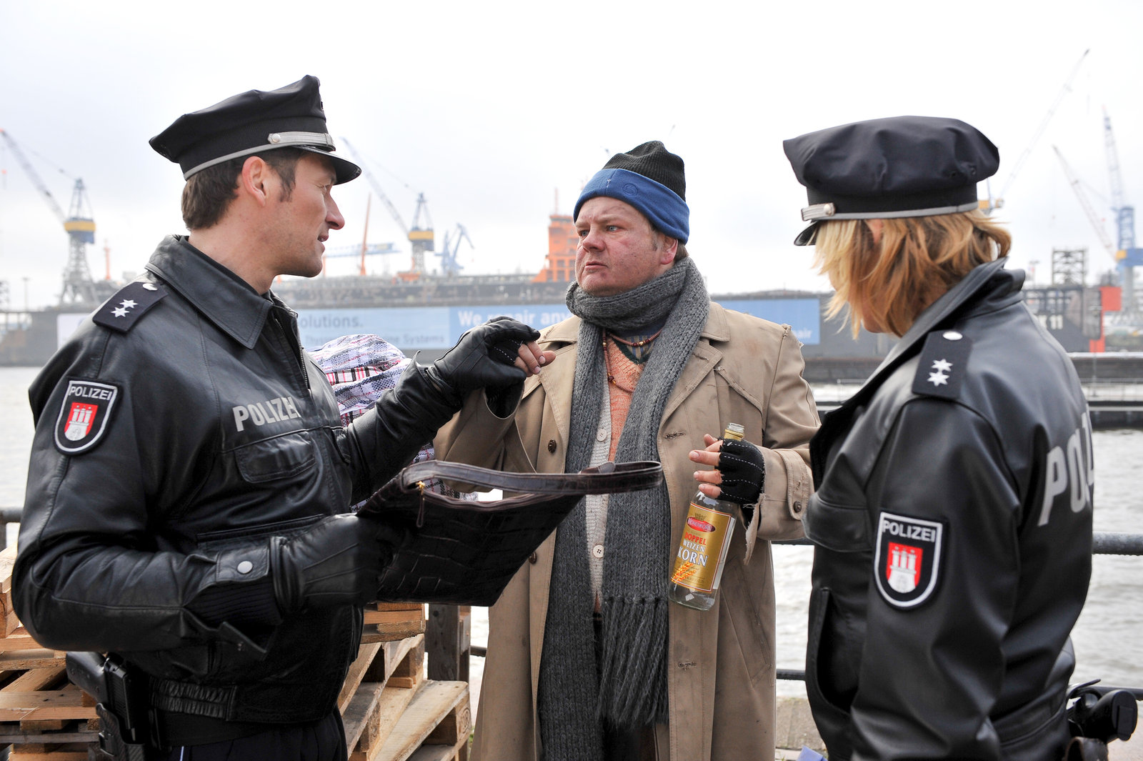 Amerikanische HochzeitDer Stadtstreicher Jochen (Matthias Buss, M.) hat die Tasche von Linda. Ist er aber auch der Dieb? Melanie (Sanna Englund, r.) und Kai (Markus Knüfken, l.) ermitteln.Bild: © ZDF und Boris Laewen