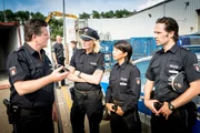 Der große BluffWährend sich Dr. Haase (Fabian Harloff, r.) um den angeschossenen Wachmann Eike Seibert (Mike Hoffmann, 2.v.r.) kümmert, befragen Claudia (Janette Rauch, l.) und Tarik (Serhat Cokgezen, 2.v.l.) dessen Freundin Nicole Bettermann (Stepanie Stumph, m.).Bild: © ZDF und Boris Laewen