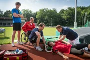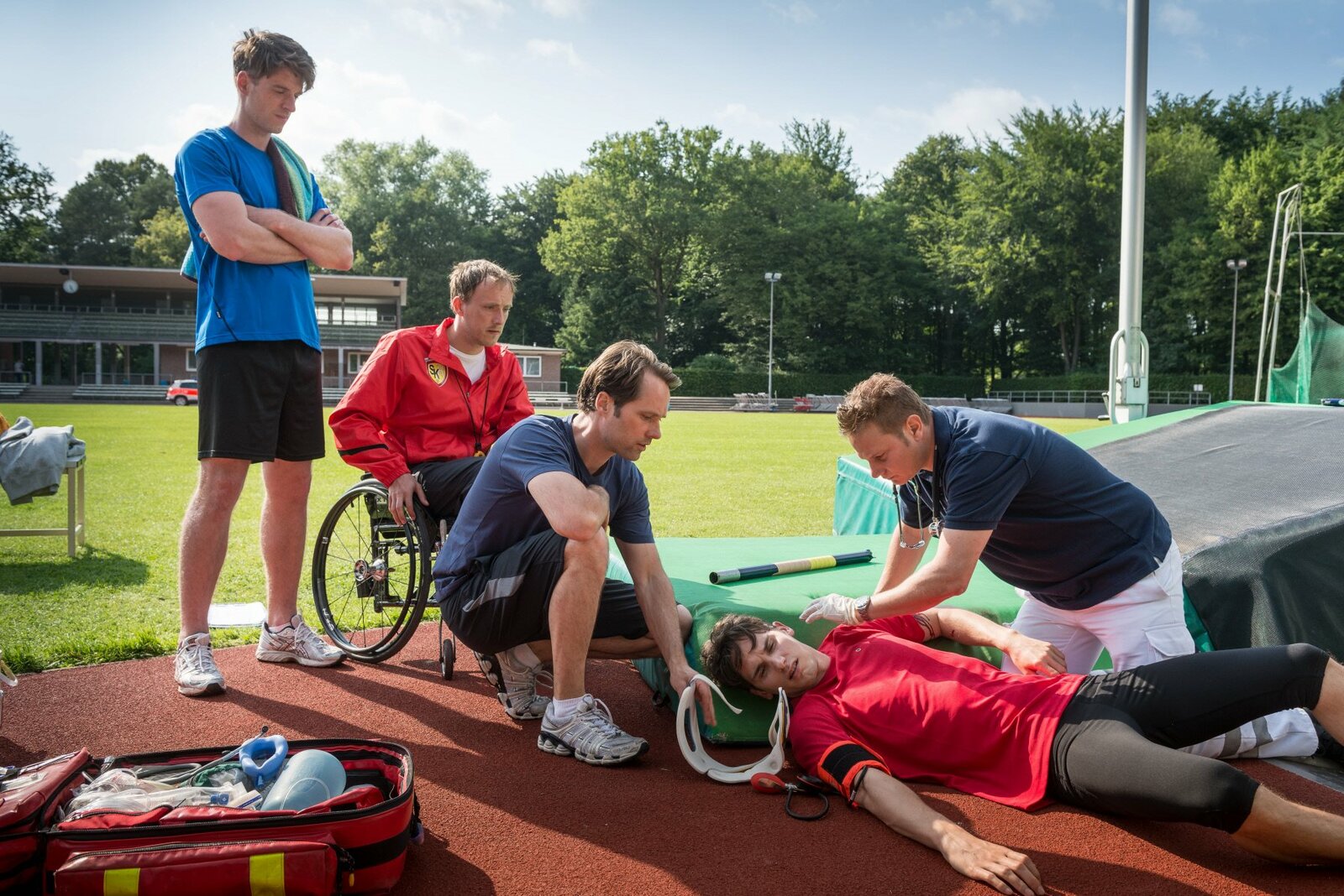 Sport ist MordDr. Haase (Fabian Harloff, r.) verarztet den Stabhochspringer Josh Baier (Daniel Fünffrock, 2.v.r.), dem im Training der Stab gebrochen ist. Mattes (Matthias Schloo, M.), Joshs Trainer Alex Wissmann (Sebastian Achilles, 2.v.l.) und sein Vereinskollege Lars (Christoph Schulenberger, l.) waren dabei, als der Unfall passierte.Bild: © ZDF und Boris Laewen