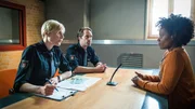 AbgeschobenIfemelu Okoye (Denise M’Baye, r.) erzählt Melanie (Sanna Englund, l.) und Mattes (Matthias Schloo, M.) ihre Version der Geschichte.Bild: © ZDF und Boris Laewen/Boris Laewen