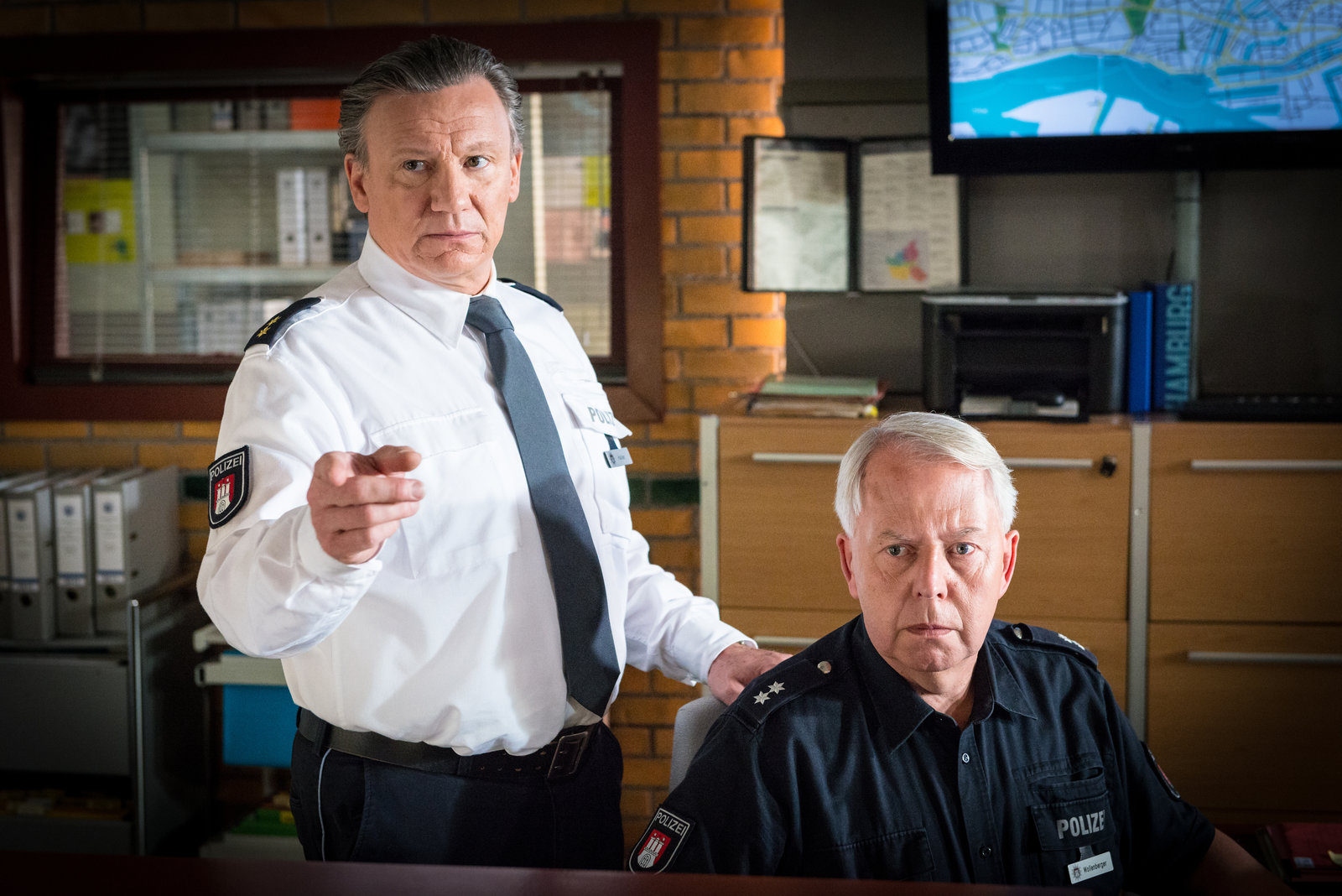 SchütteltraumaHaller (Hannes Hellmann, l.) gibt Wolle (Harald Maack, r.) den Auftrag, die Großfahndung nach den zwei verschwundenen Mädchen einzuleiten.Bild: © ZDF und Boris Laewen