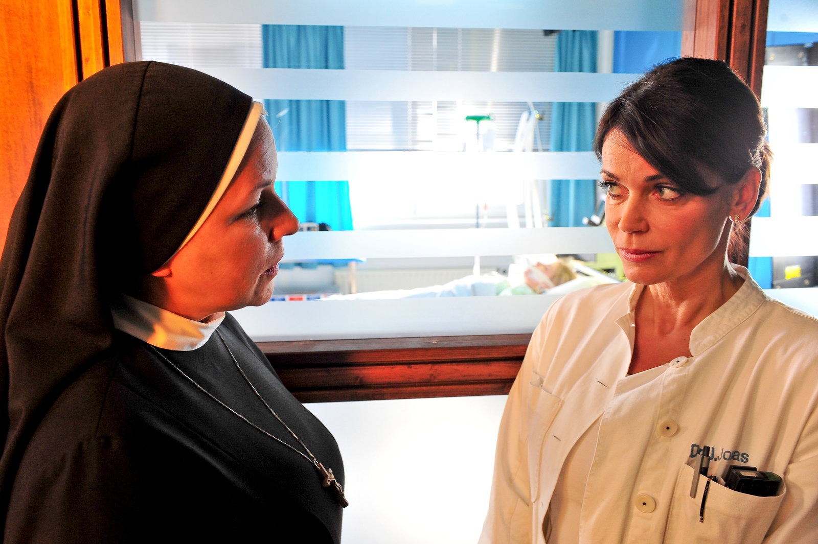 Schlaf, Kindchen, schlafSchwester Agnes (Bettina Kupfer, l.) erkundigt sich bei Dr. Jasmin Jonas (Gerit Kling, r.) nach der jungen Frau, die heute ins EKH eingeliefert wurde.Bild: © ZDF und Boris Laewen
