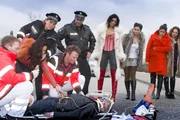 BeinhartHaase (Fabian Harloff, 4.v.l.) versorgt Ingo Beuters (Tim Wilde, liegend), der absichtlich von einem Fahrzeug überfahren wurde. Seine Verlobte Giovanna (Maja Maneiro, 2.v.l.) und deren Kolleginnen waren zur Tatzeit am Tatort, wollen aber vor Claudia (Janette Rauch, 3.v.l.) und Tarik (Serhat Cokgezen, m.) keine Aussage machen.Bild: © ZDF und Boris Laewen