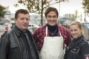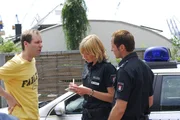 GoldfischMelanie (Sanna Englund, r.) und Mattes (Matthias Schloo, M.) werden zu einem Einsatz gerufen: Der Reporter Uwe Frosch alias Froschauge (René Dumont, l.) ist überfallen worden. Was haben die Täter gesucht?Bild: © ZDF und Boris Laewen