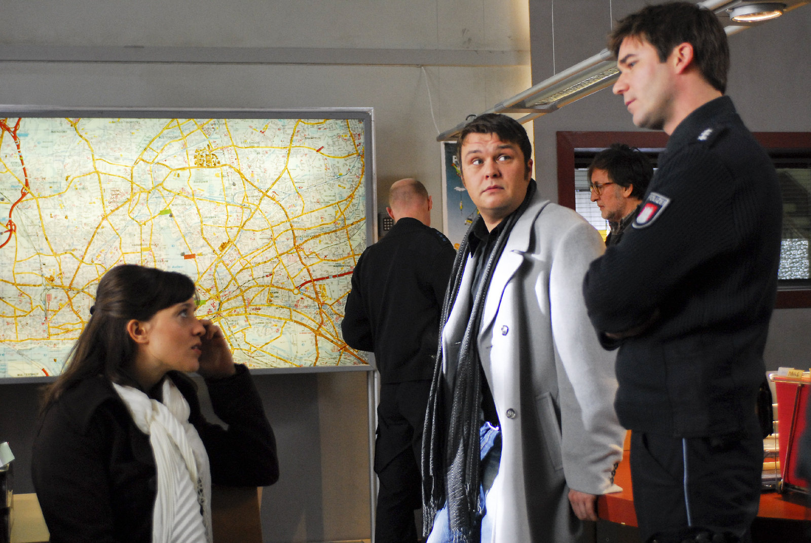 Auf schmalem GratDie junge Frau Denise (Julie Bräuning) und ihr Freund Mike (Björn Grundies, l.) melden im PK21 bei Nils (Thomas Scharff, r.) einen gewaltätigen Angriff eines unbekannten Schlägers. (Im Hintergrund: Komparse)Bild: © ZDF und Boris Laewen