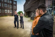CrystalTomas (Filip Grujic, r.) zwingt Hans (Bruno F. Apitz, l.) und Franzi (Rhea Harder-Vennewald, 2.v.l.) ihre Waffen niederzulegen, sonst wird er Nelly (Lisa Marie Fix, 2.v.r.) etwas antun.Bild: © ZDF und Boris Laewen