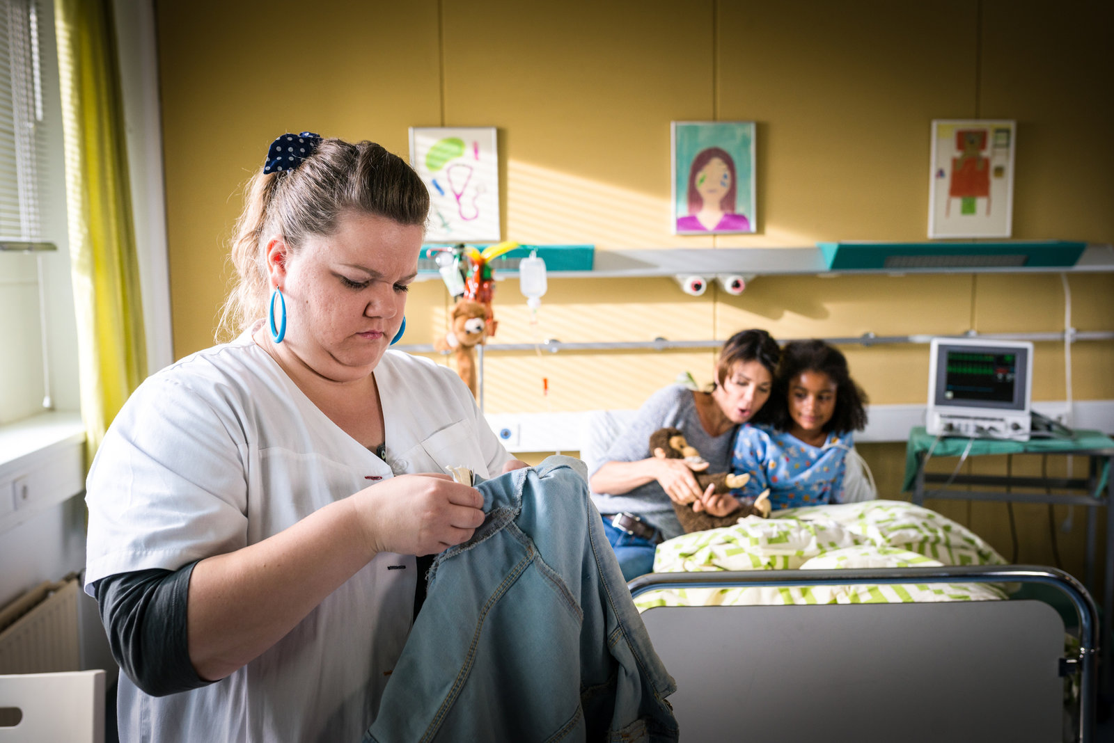 HelpFrauke (Manuela Wisbeck, im Vordergrund) findet in der Jacke ihrer kleinen Patientin (Rokhaya Boye, r.) einen Zettel mit einer Adresse. Vielleicht hilft das Dr. Jonas (Gerit Kling, m.) den Vater des Mädchens ausfindig zu machen.Bild: © ZDF und Boris Laewen