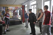 Knock OutHenning (Uwe Fellensiek, M.) ermittelt im Boxstudio wegen des Anschlags auf den Colonel. Er befragt Mike (Frederick Lau, 2.v.r.), André (Matthias Reichwald, r.) und weitere Sportler (Komparsen).Bild: © ZDF und Boris Laewen-bola
