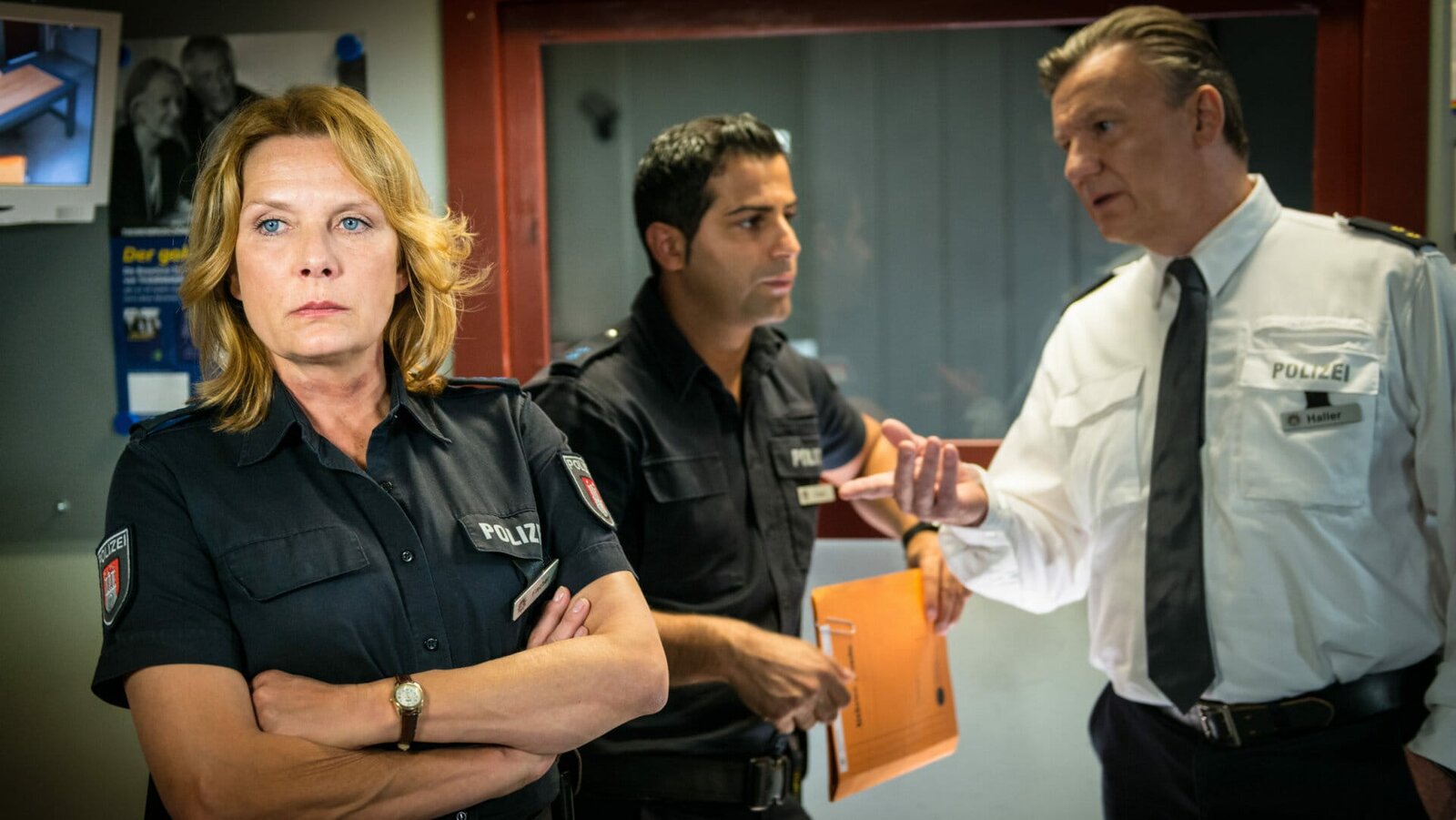 AngstClaudia (Janette Rauch) ist sauer: Haller (Hannes Hellmann, r.) möchte, dass Tarik (Serhat Cokgezen, M.) und sie einer anderen Spur folgen.Bild: © ZDF und Boris Laewen/Boris Laewen