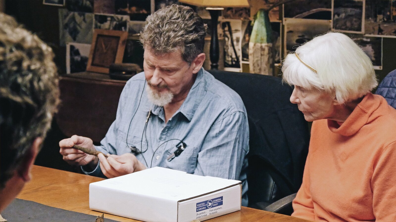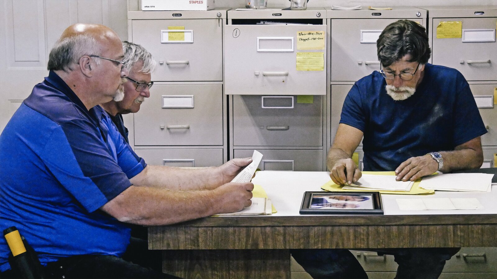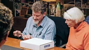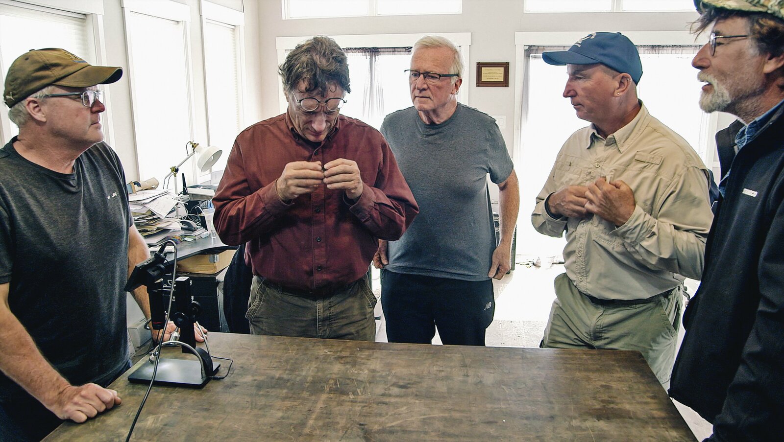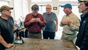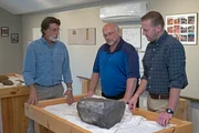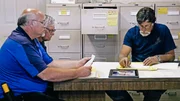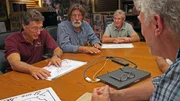 Auf der richtigen SpurAls Schatzsucher Rick Lagina (l.) und sein Team beginnen, den berüchtigten "Money Pit" freizulegen, zeigt ihnen ein Besucher Beweise, dass Schätze aus König Salomons Tempel auf Oak Island vergraben sein könntenBild: © 2014 A&E Television Networks, LLC. All Rights Reserved/ PROMETHEUS ENTERTAINMENT Lizenzbild frei