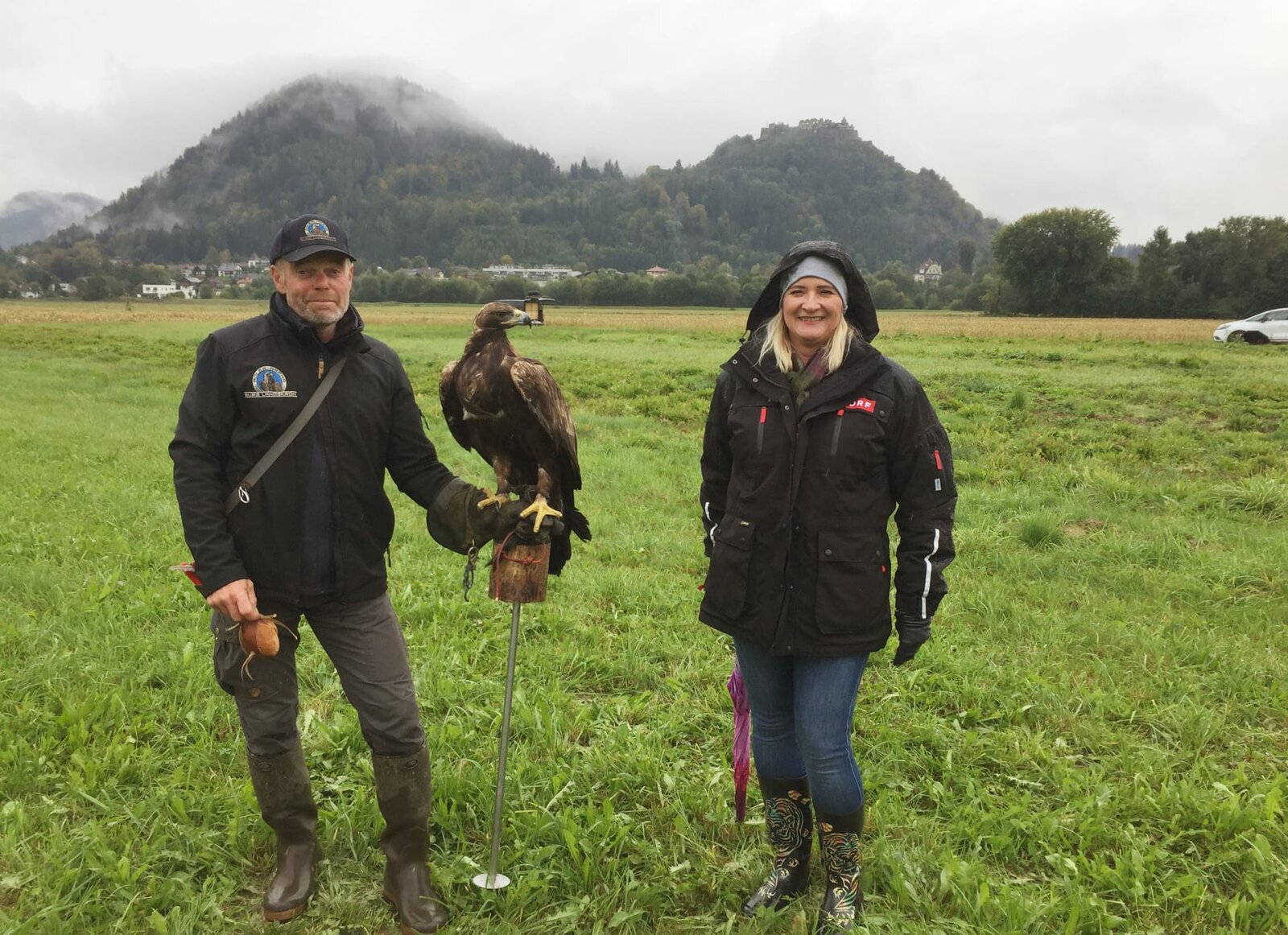 Franz Schüttelkopf (Greifvogelexperte und Mitgründer der Adlerarena Landskron) und Barbara Liebminger (ORF) mit Steinadlerdame Florence.Bild: © ORF/ORF Kärnten