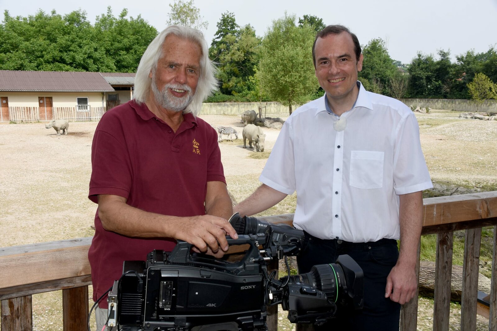 Dr. Dr. Andreas Artmann, Eigentümer des Aquazoos Schmiding, mit Erich Pröll vor dem Nashorn-Gehege.Bild: © ORF/Erich Pröll/Jutta-Anna Wirth