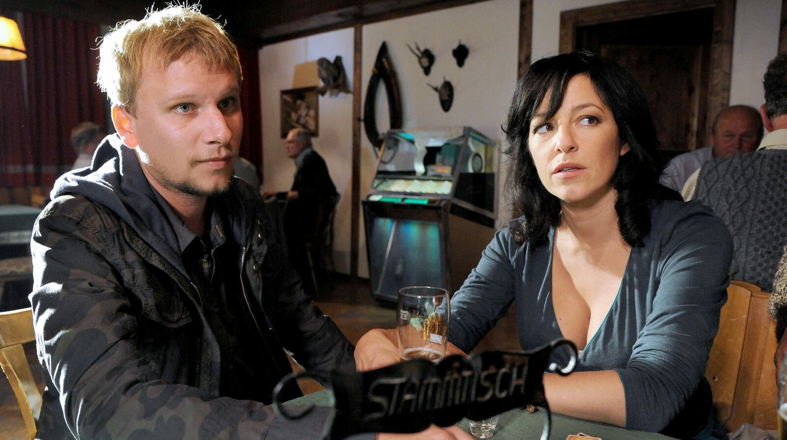 SteirerblutSandras Mutter Helga Mohr (Aglaia Szyszkowitz) stellt sich bei Sascha Bergmann (Hary Prinz) schützend vor ihren vorbestraften Sohn.Bild: © Allegro Film/ARD Degeto/BR/Petro Domenigg