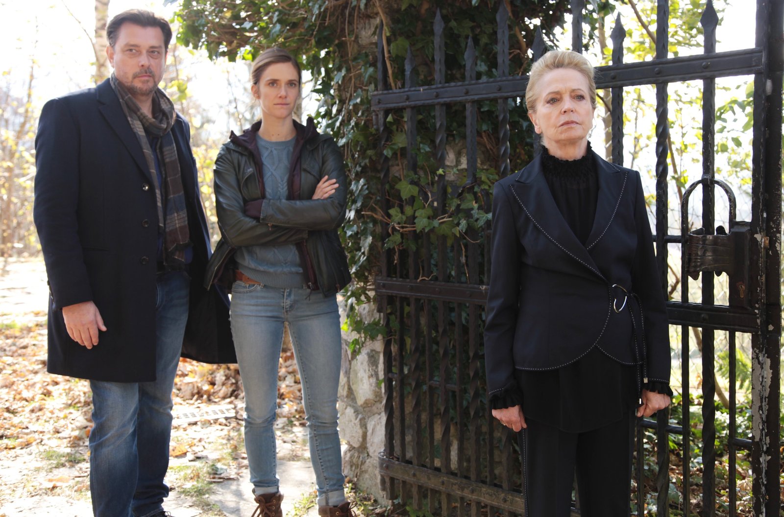 SteirerkreuzPauline Fürst (Gisela Schneeberger, re.) verbittet sich allzu direkte Fragen von Sandra Mohr (Miriam Stein, Mitte) und Sascha Bergmann (Hary Prinz).Bild: © ARD Degeto/Allegro Film/Stefan Haring