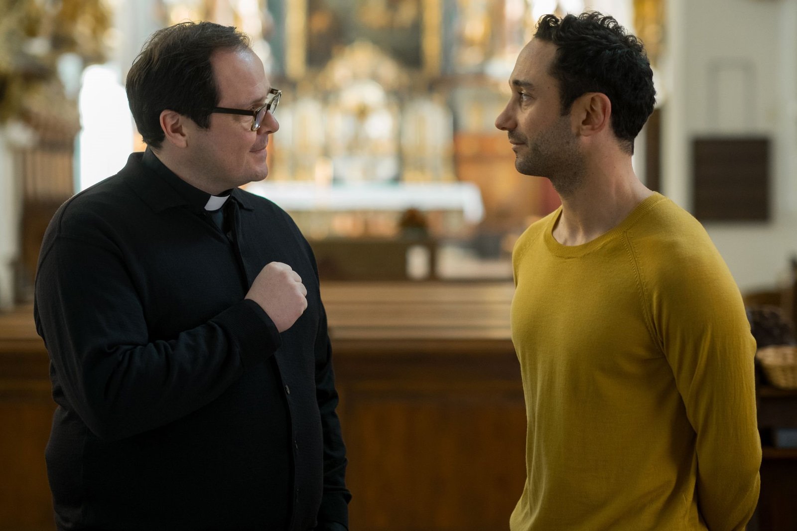 Herrgott für AnfängerPriester Benedikt (Thomas Mraz, links) und Musa (Deniz Cooper).Bild: © BR/Lotus-Film/ORF/Petro Domenigg / Petro Domenigg