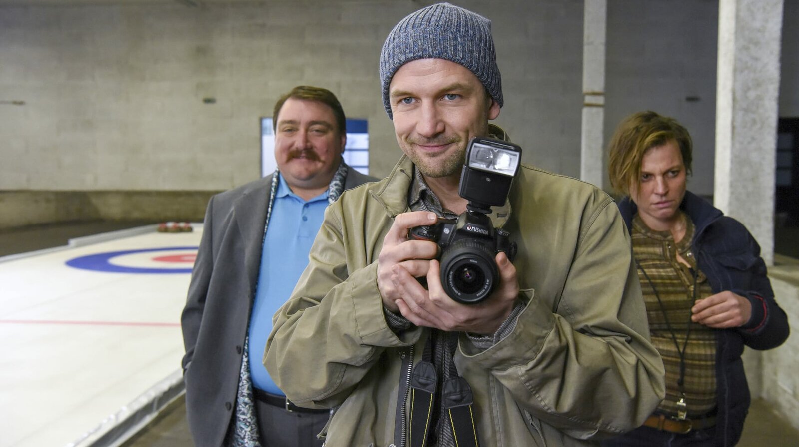 Curling für Eisenstadtv.li.: Hendl Kaiser (Christoph Krutzler), David Kovac (Oliver Rosskopf), Petra Glewitz (Maria Simon-Lade).Bild: © MDR/ORF/Hubert Mican