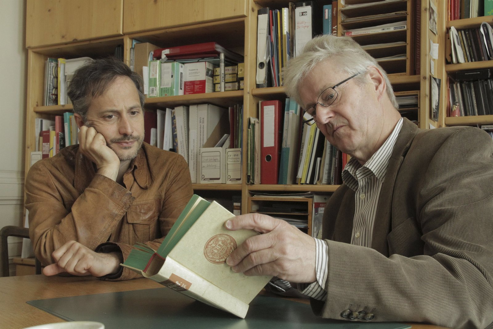 Von Extremschrammlern und GstanzlartistenMichael Ostrowski (li) und Rudi Pietsch (re): Pietsch zeigt Ostrowski das Steyrische Rasplwerk von Konrad Mautner in dem viele Gstanzl und Taenze des Ausseer Lands verzeichnet sind.Bild: © ServusTV / FCKW Filmproduktion