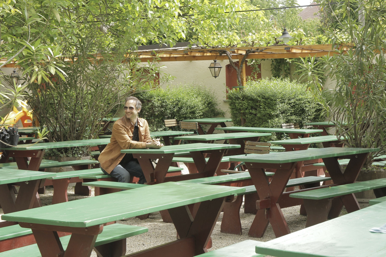 Liebe und TodMichael Ostrowski wartet auf Agnes Palmisano beim Heurigen Hengl-HaselbrunnerBild: © ServusTV / FCKW Filmproduktion