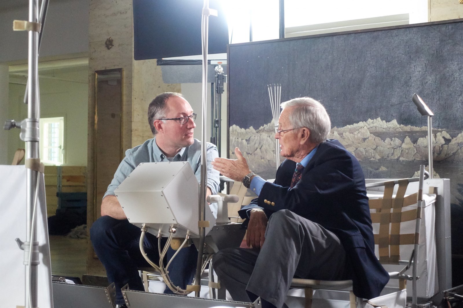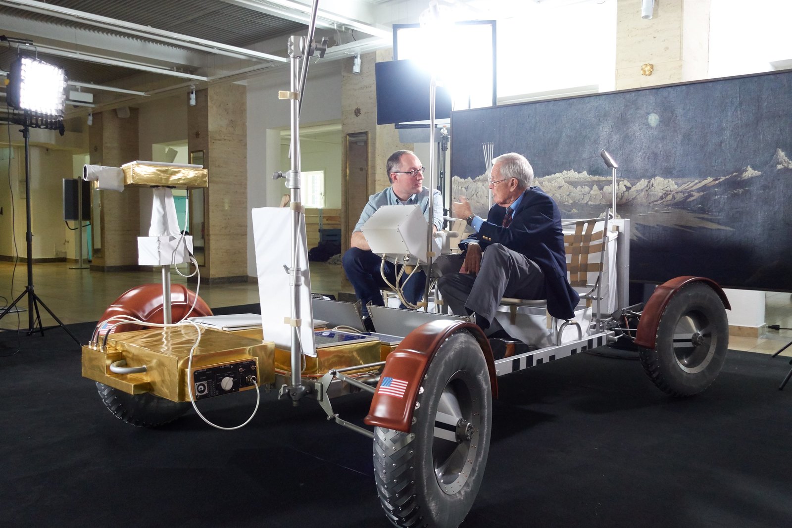 Spezial: 50 Jahre MondlandungP.M. Wissen-Moderator Gernot Grömer mit Apollo-16-Astronaut und Moonwalker Charles Moss "Charlie" Duke beim Interview in einem Nachbau des Mondrovers, Ort: Deutsches Museum, MünchenBild: © ServusTV / Bilderfest