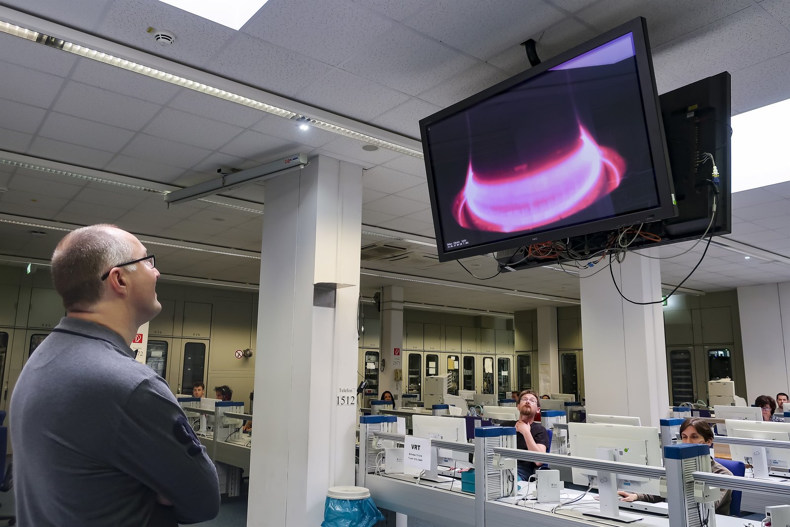 Folge 37Gernot Grömer im Kontrollzentrum, am Bildschirm live die Zündung der Fusion; Eine Spezialkamera im Reaktor zeichnet die Plasmaentladung auf. Das pinke Leuchten ist das Plasma.Bild: © ServusTV / Bilderfest